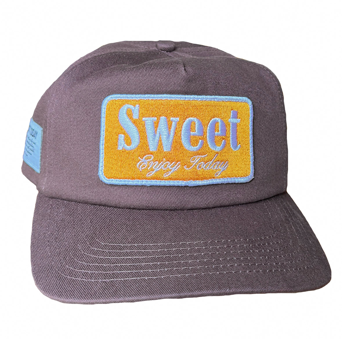 A modern take on the vintage ballcaps of the past, introducing the Sweet Enjoy Today Patch hat in brown. Made with a cotton twill fabric, this hat features an embroidered patch at front with our message of enjoying today sewn on the side. The hat is finished with our message that "Someday you will miss today" on the interior of the hat.