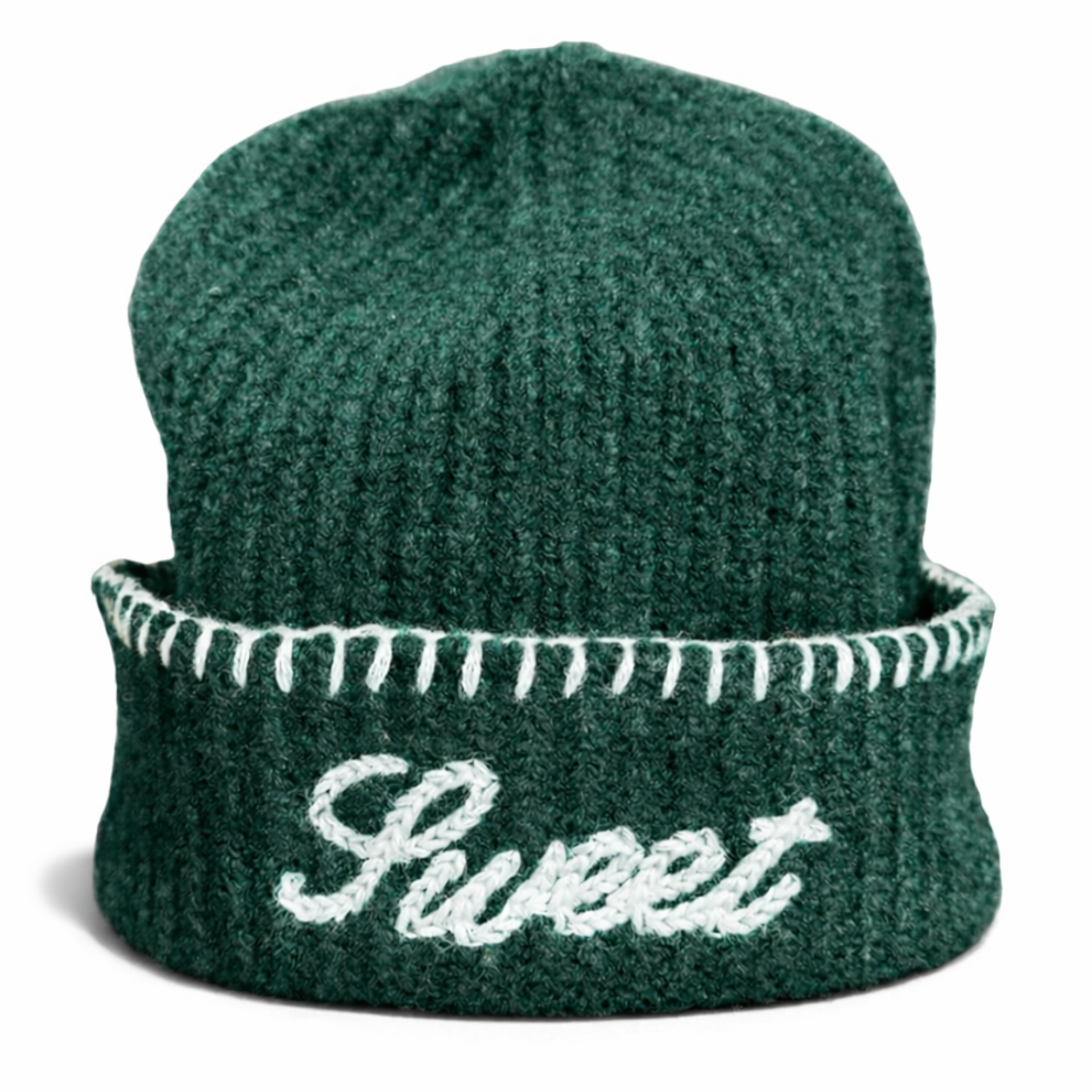 Introducing our Sweet Knit Beanie in our classic Emerald Dark Green. This beanie features a chain stitch embroidery logo and is complemented with a hand stitched white yarn throughout.