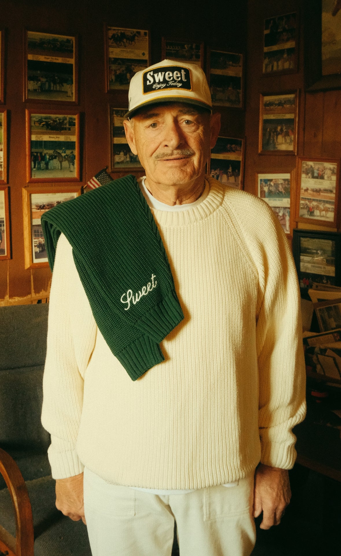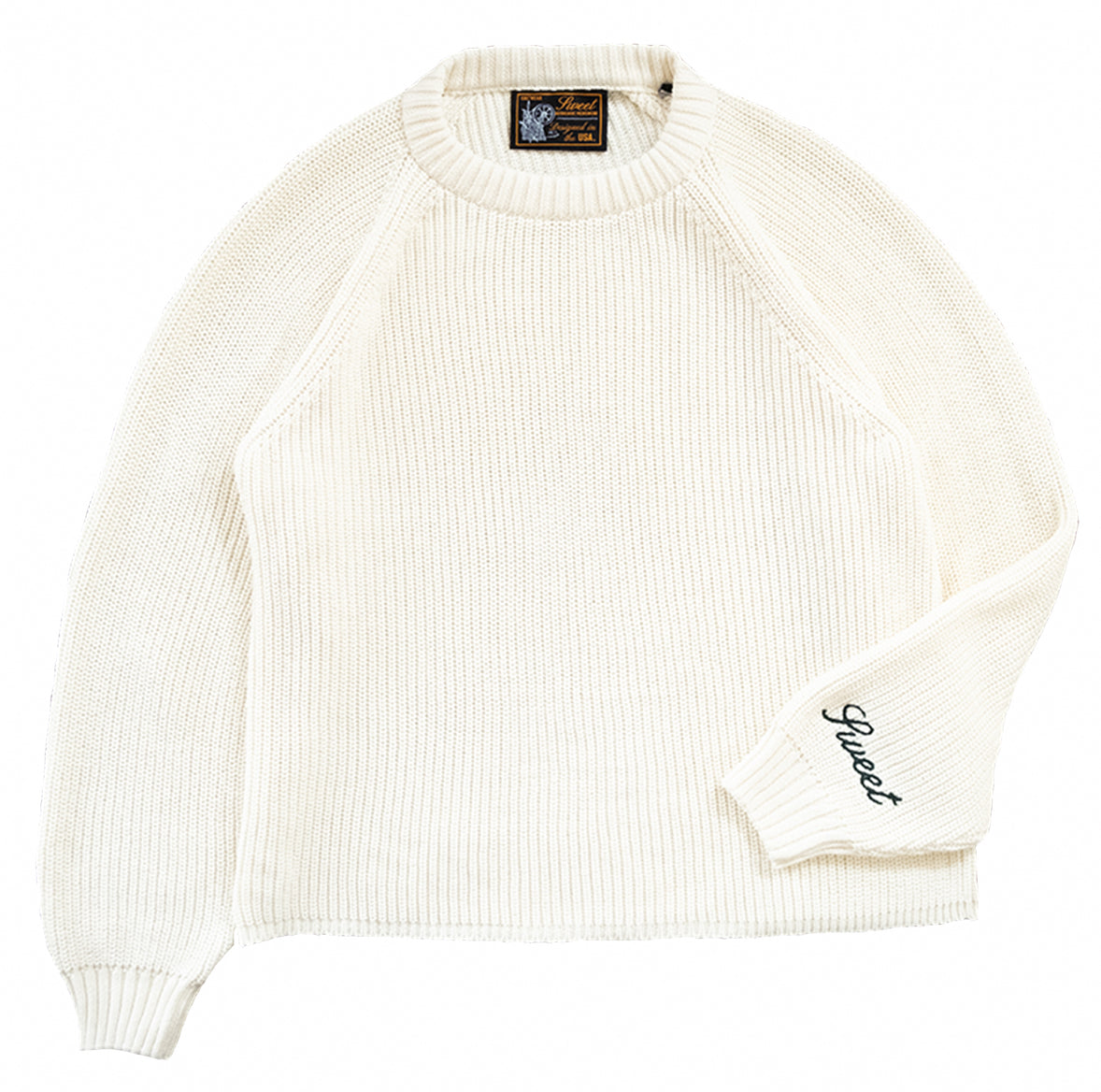 Cut & Sewn from a Portuguese cotton yarn fabric, our Sweet Knitwear Sweater comes in our off-white colorway. The essential knit sweater features a green sweet rope embroidery at the left sleeve with contrasting raglan sleeves. The knit carries a midweight & soft feel and is finished by our interior sewn on knitwear label.
