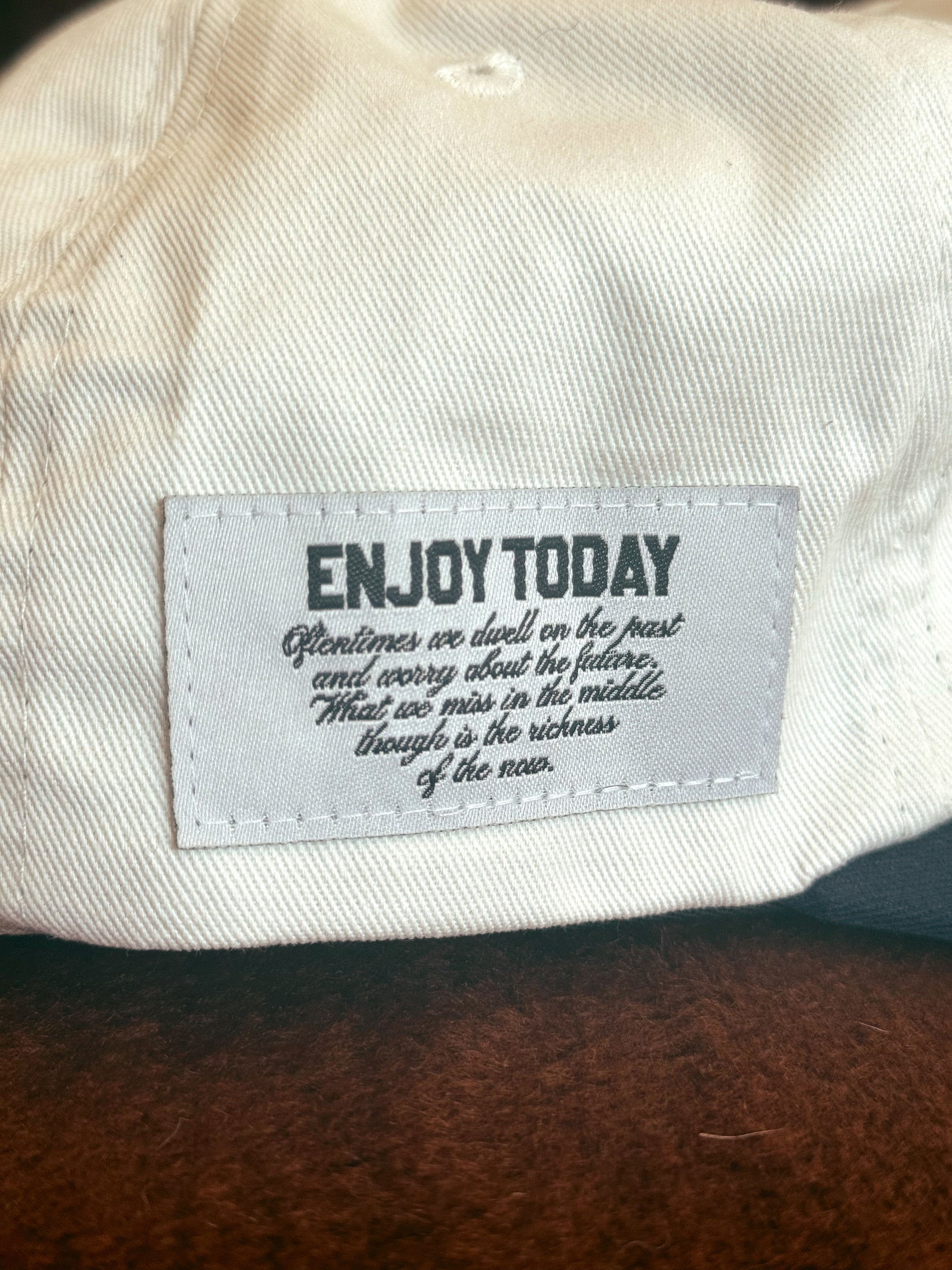 A modern take on the vintage ballcaps of the past, introducing the Sweet Enjoy Today Patch hat in off-white, navy, and red. Made with a cotton twill fabric, this hat features an embroidered patch at front with our message of enjoying today sewn on the side. The hat is finished with our message that "Someday you will miss today" on the interior of the hat.