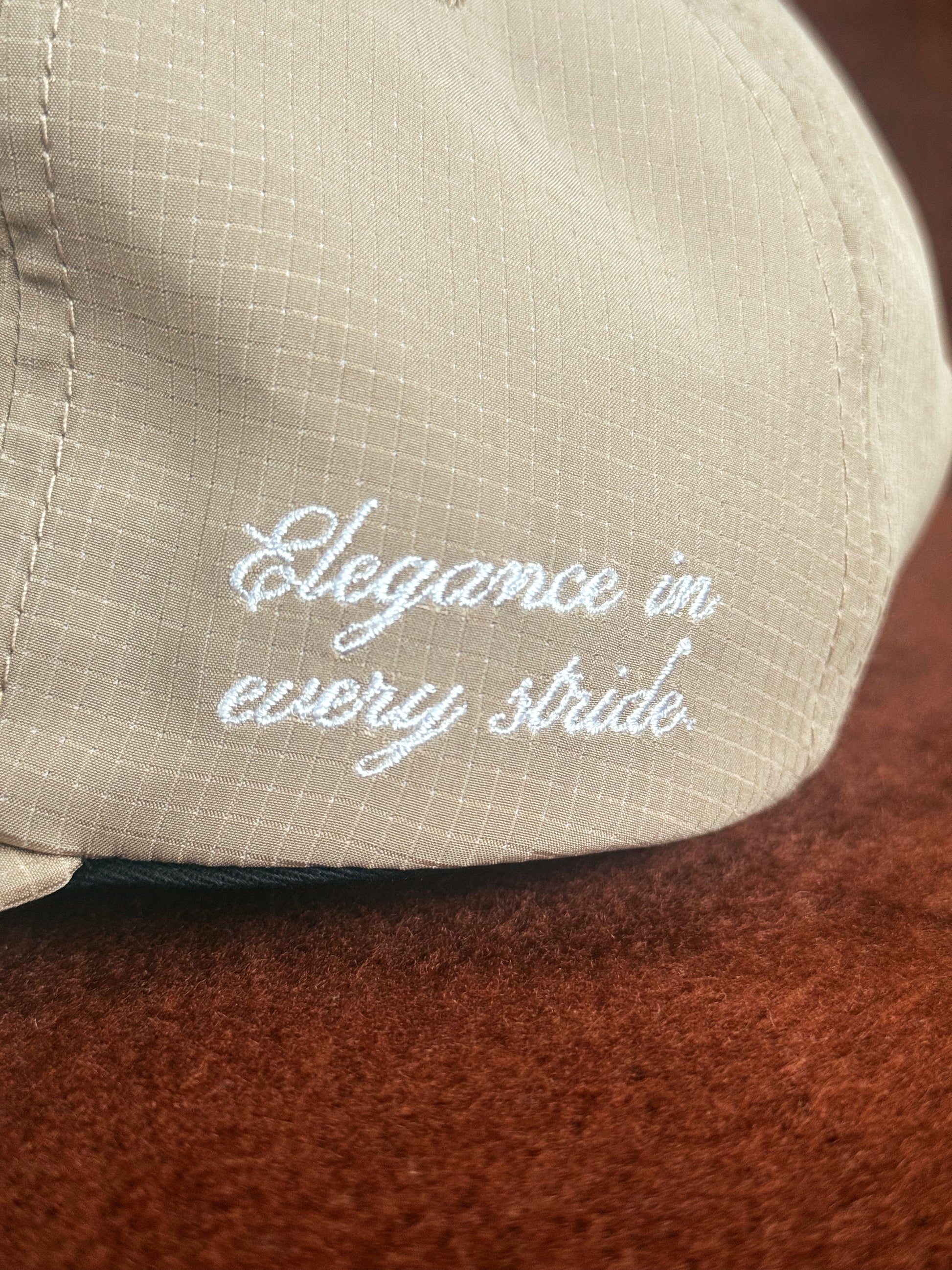 Made from breathable nylon, it features a small front embroidery, a Secretariat racing-silk–inspired patch at the side, and a subtle “Elegance in every stride” embroidery detail. On the interior, our message “Someday you will miss today” is sewn.