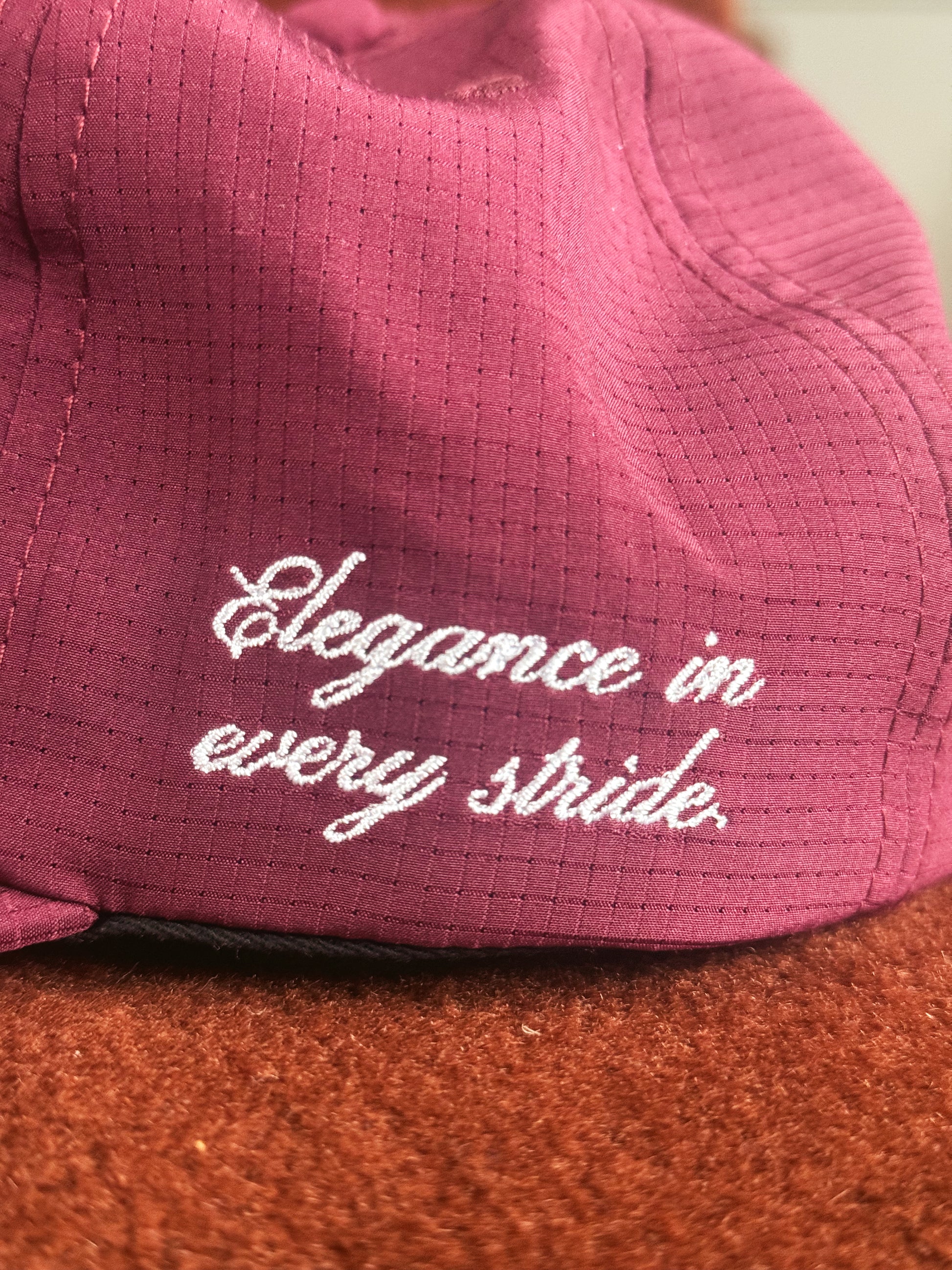 Made from breathable nylon, it features a small front embroidery, a Secretariat racing-silk–inspired patch at the side, and a subtle “Elegance in every stride” embroidery detail. On the interior, our message “Someday you will miss today” is sewn.